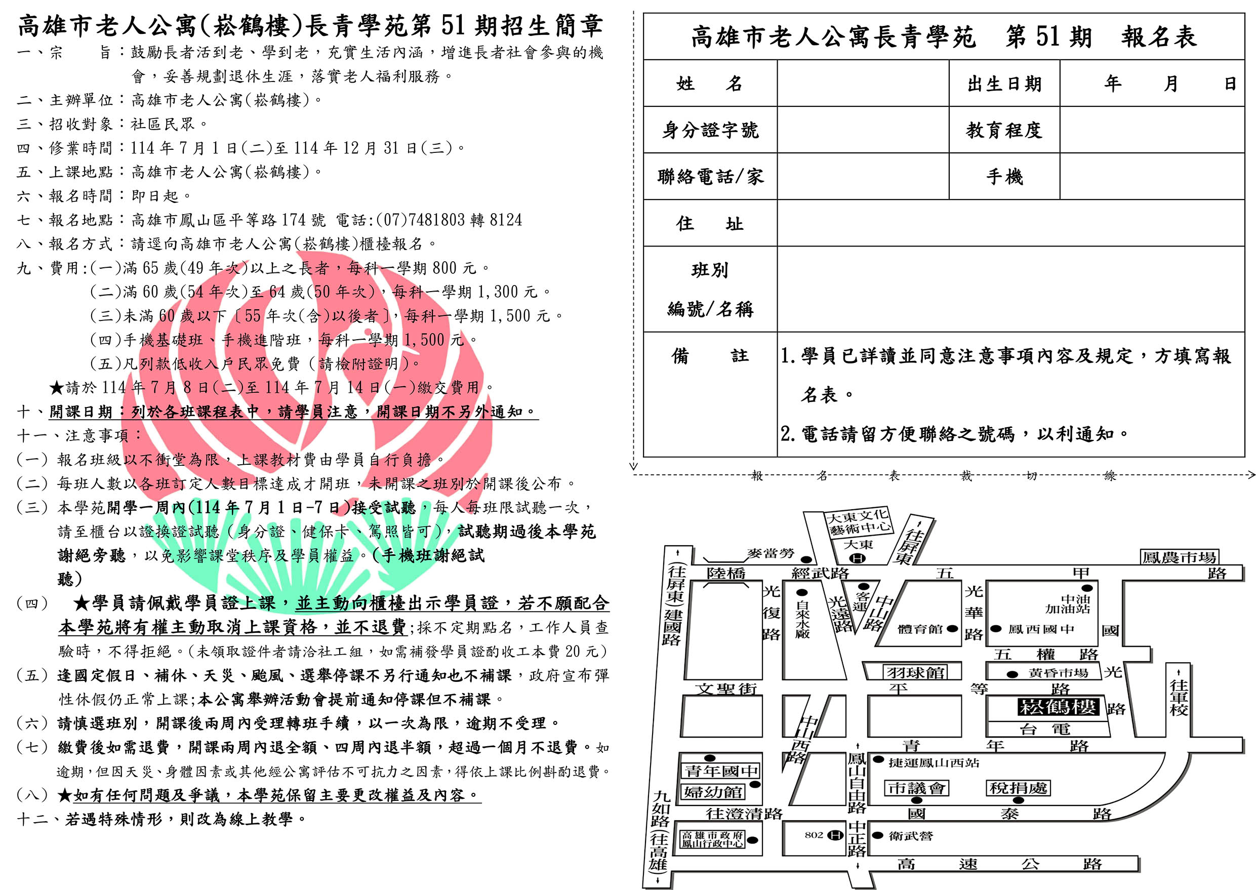 上課地點:高雄市老人公寓 (崧鶴樓)。