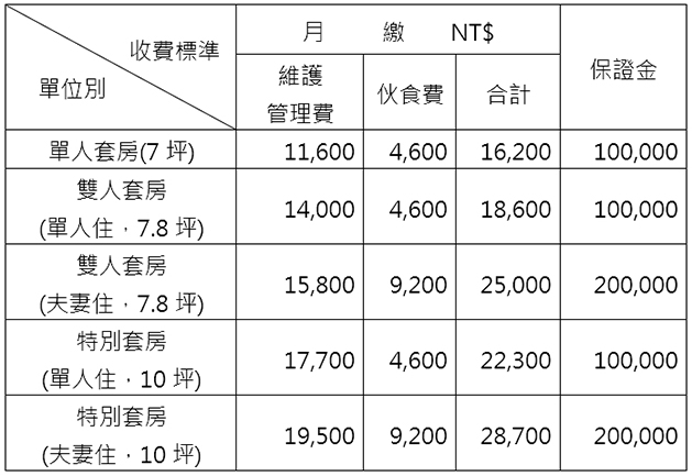 月繳項目於每月一日繳納,日繳項目於服務起始日一次付清。管理費用途包括一般公共設施之清潔維護、公物使用及維修、一般水電空調、行政業務及與本公寓有關之公共服務項目之開銷。個人被服、日用品、寢室超用水電空調、房間打掃、衣服洗滌、外線電話安裝、醫療、特別看護費、交通、殮葬等個別費用由居民自行負擔。